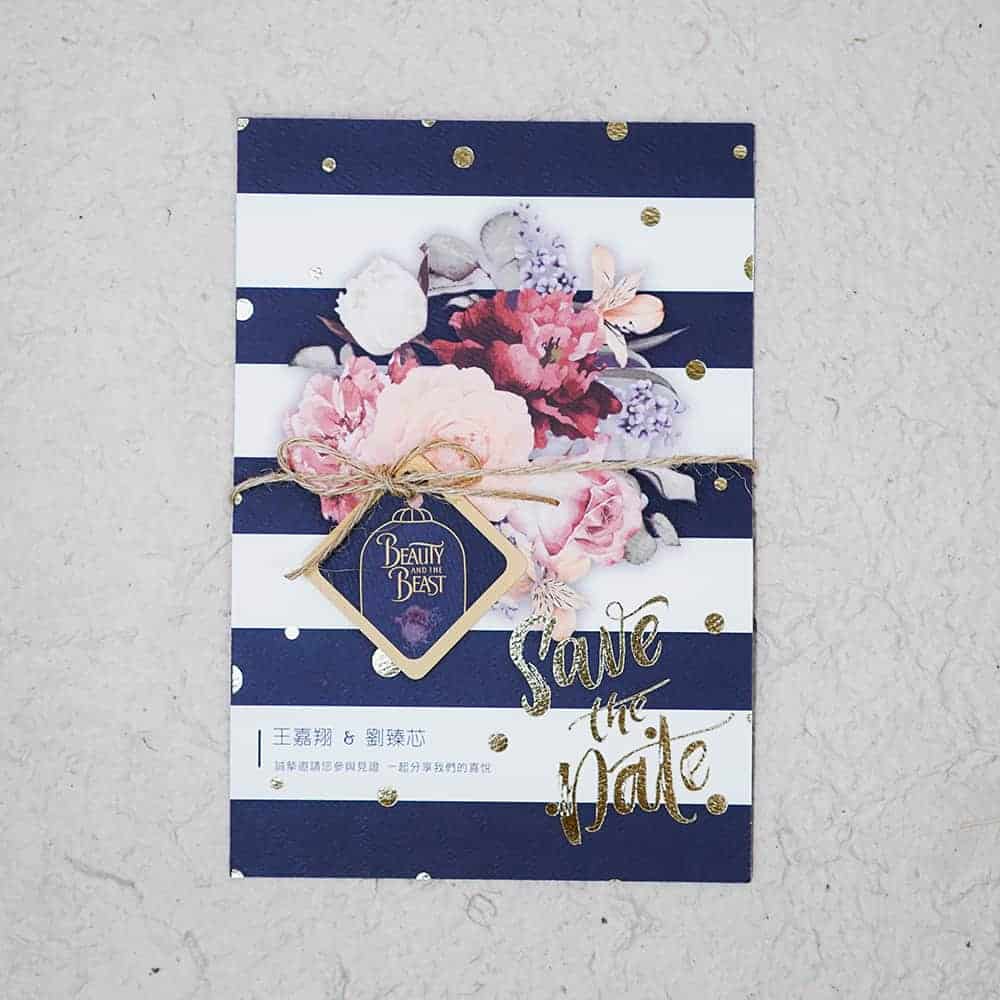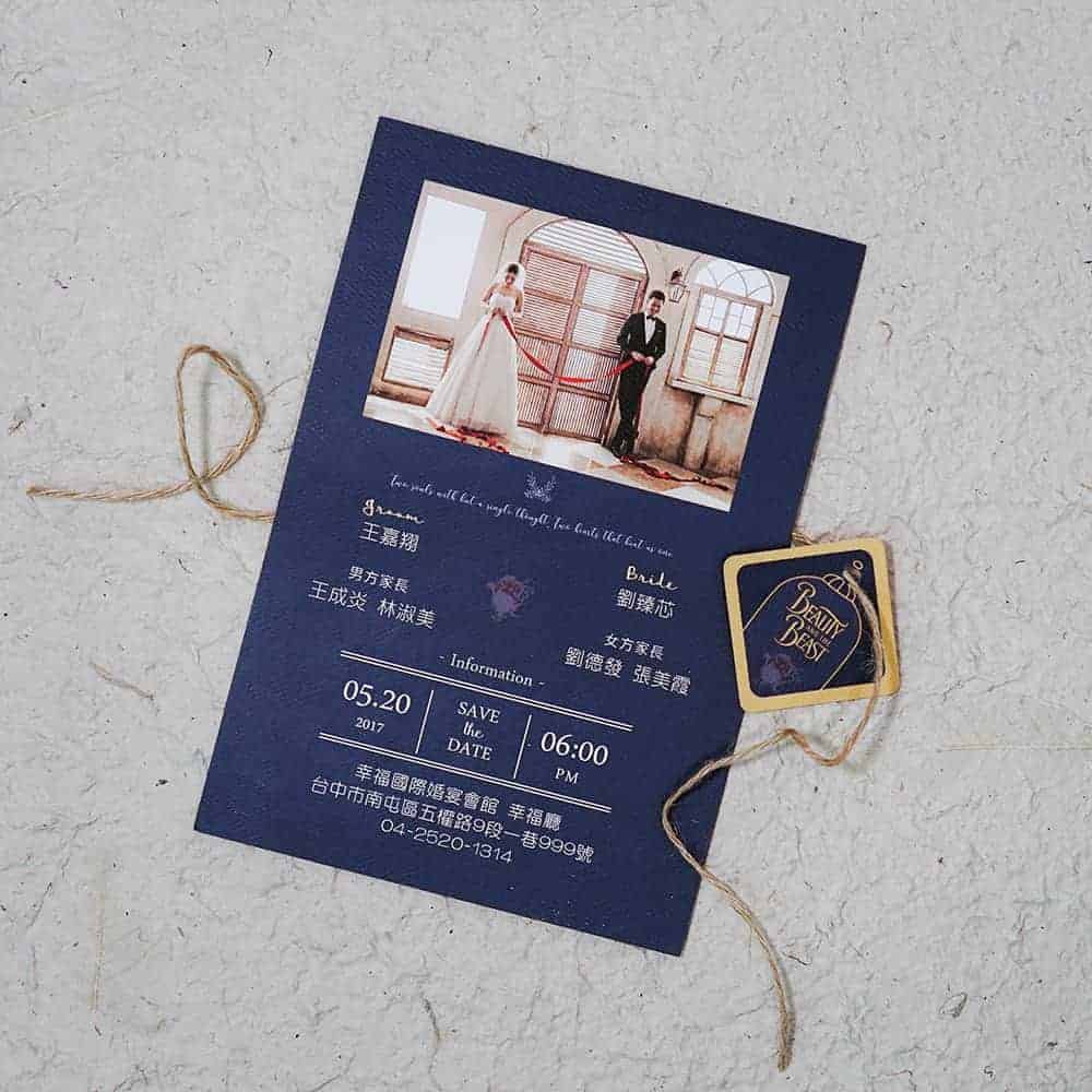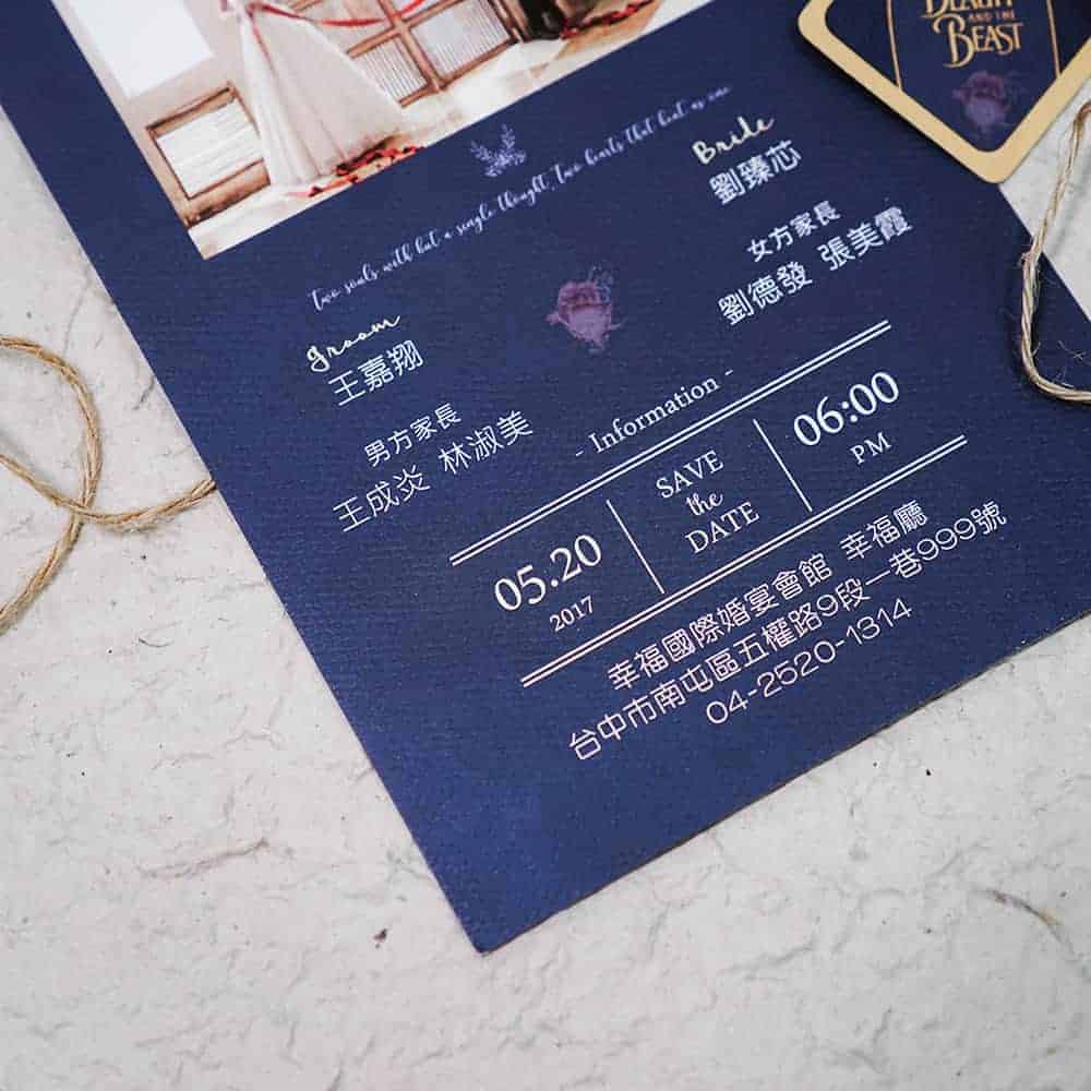 美國迪士尼公司的浪漫奇幻歌舞電影,《美女與野獸》故事劇情唯美是多數人小時候必看長大後必回憶的影集。因此我們將喜帖與此劇做結合讓喜帖更有電影魔幻的力量,讓人收到喜帖更是腦海浮現電影情節。