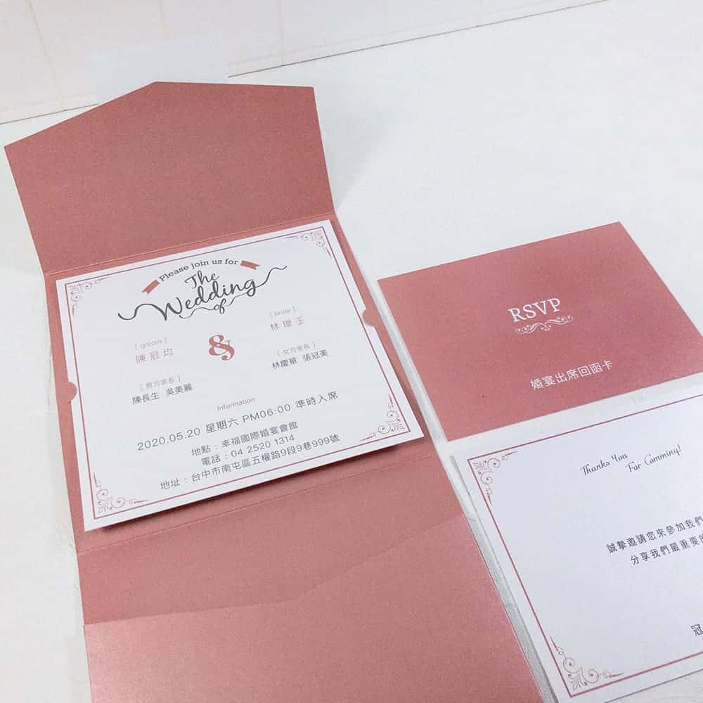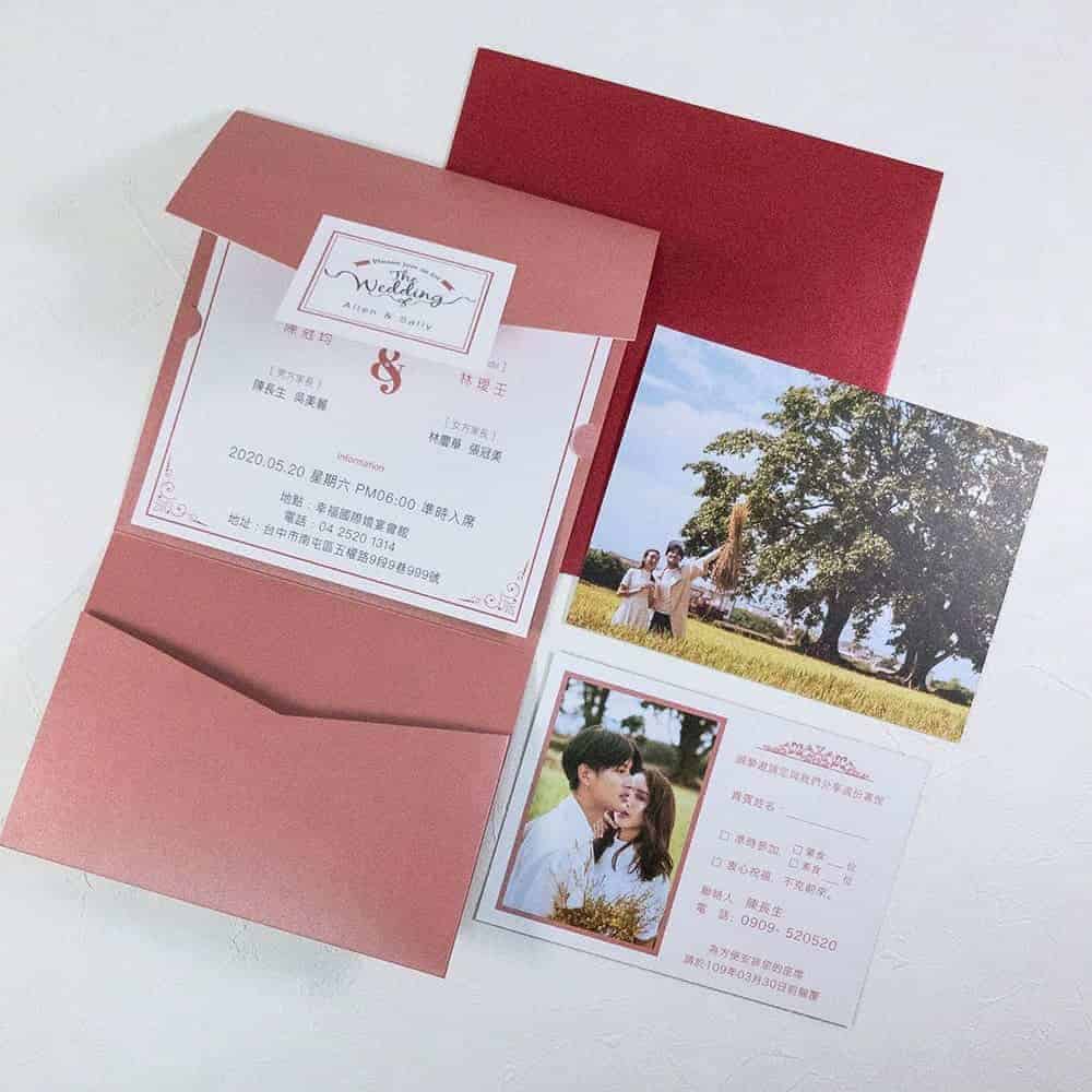 • 喜帖尺寸:外層42.7×19.7公分(展開)+內文14×14公分+感謝卡14.6×11公分+回函卡14×10公分(含出血)