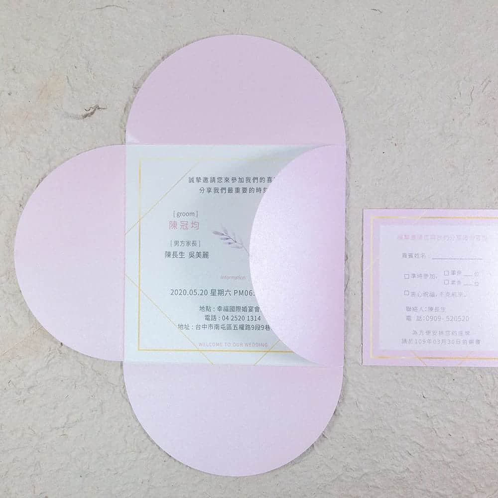 花瓣軋型喜帖,可以DIY買個封蠟上去感覺更不一樣(須自行另買),此款再加上回函卡(您也可以換放照片喔)利用回函卡讓整個喜帖更多層感。