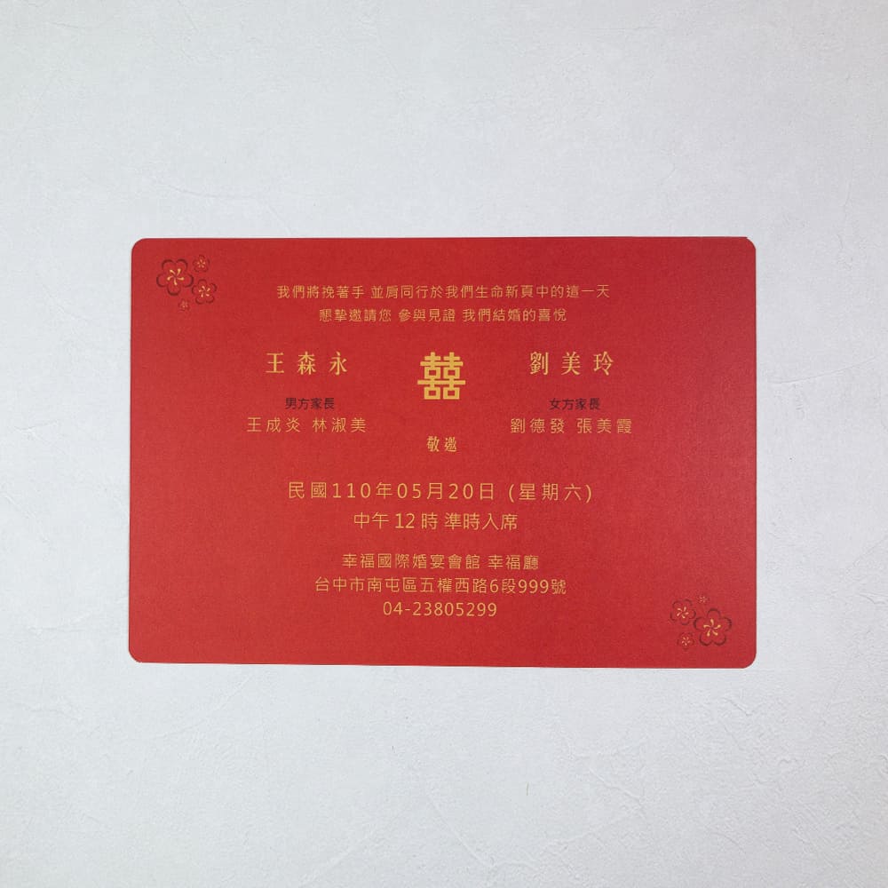 • 四邊導圓角,含喜帖正面燙亮金(須提供英文名字燙金)