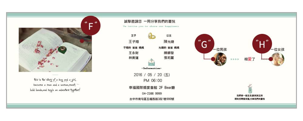 • 須準備張照片(封面橫式一張+封面四宮格照+內頁橫式照一張+男女獨照兩張),如不放照片請慎選款式。