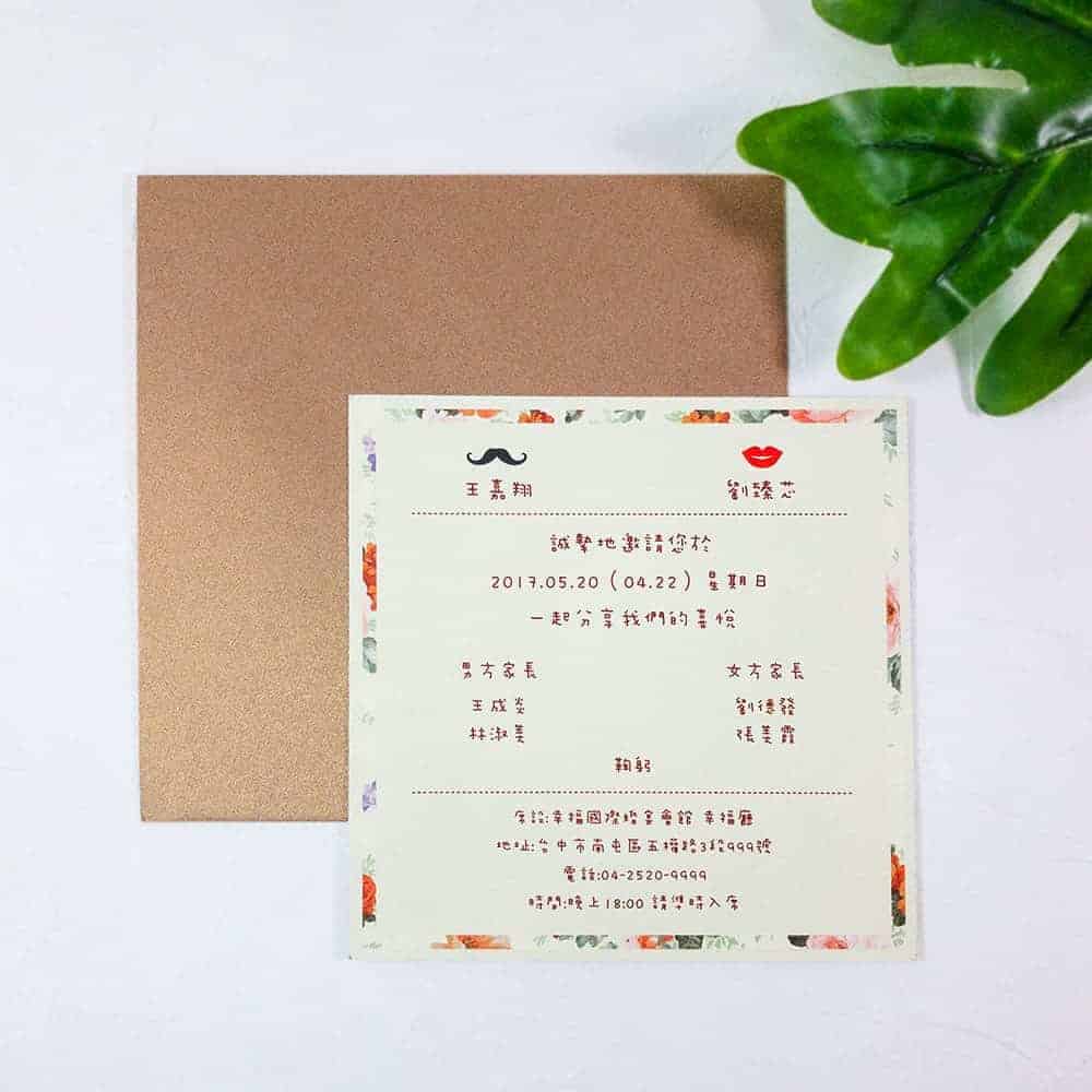 • 喜帖尺寸:14.5×14.5公分(含出血) 請注意此款為明信片單張款式喔