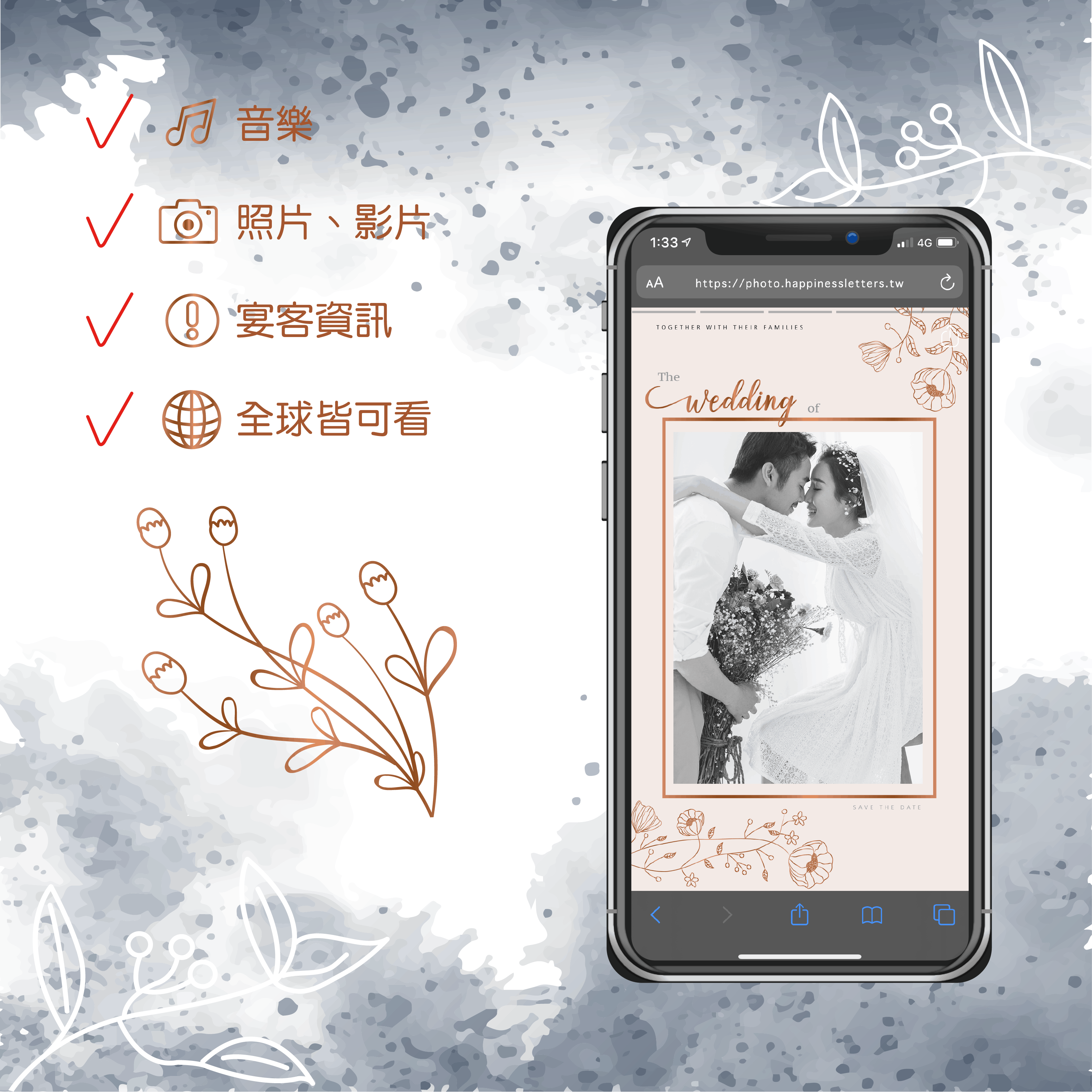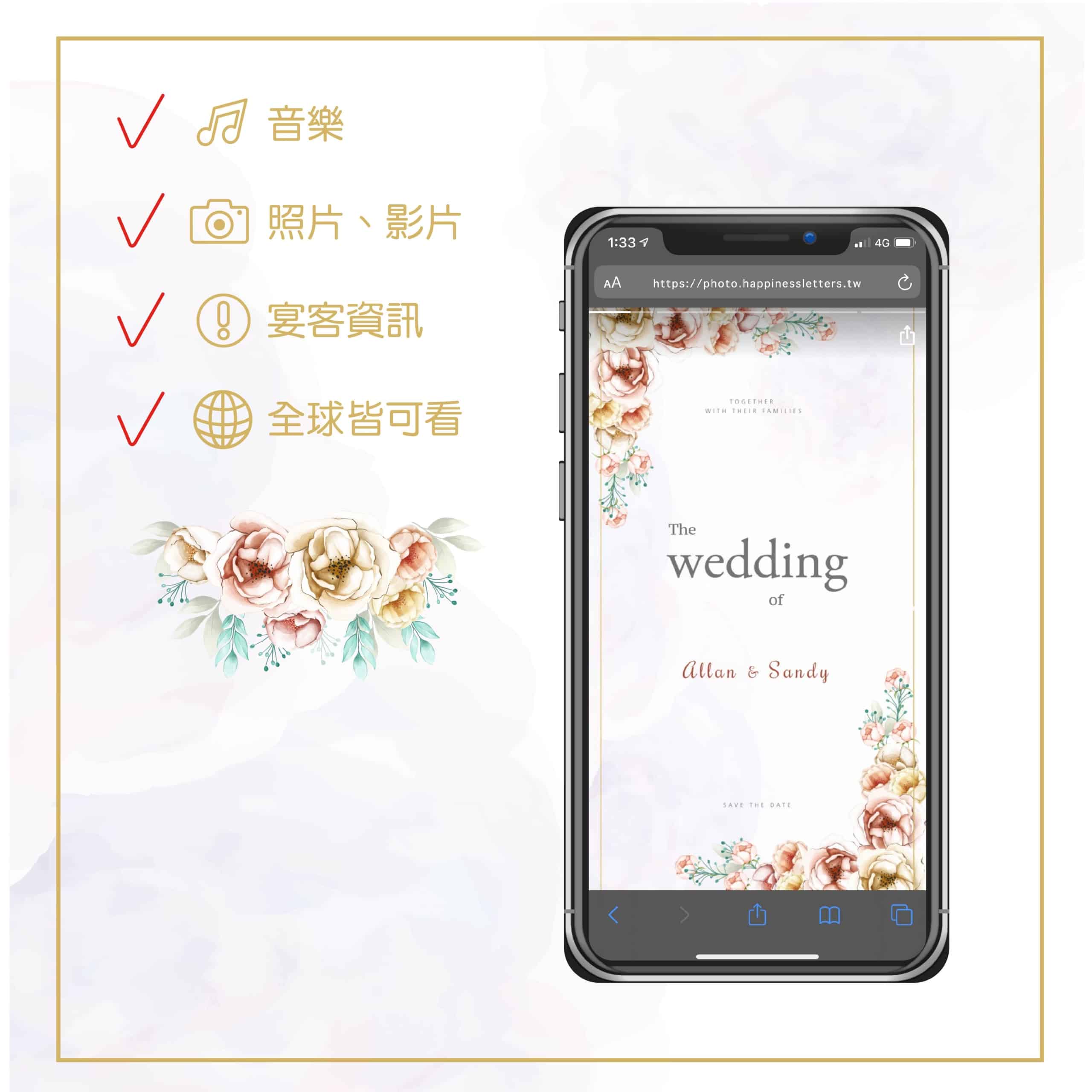 編排下單完會贈送一組網址以及照片檔給您您隨時可使用傳送